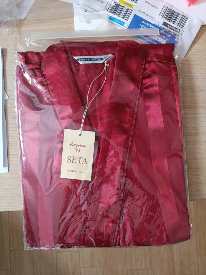 Vestaglia da donna in seta, taglia M, con motivo a righe tono su tono. Nuova nella sua confezione, che non apro perché non saprei rimetterla a posto per benino .
