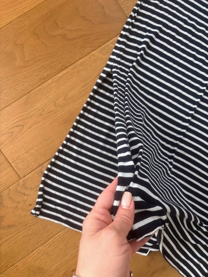 Non so più la composizione né la marca perché ho tagliato i cartellini ma è molto bello a righe blu e bianco.