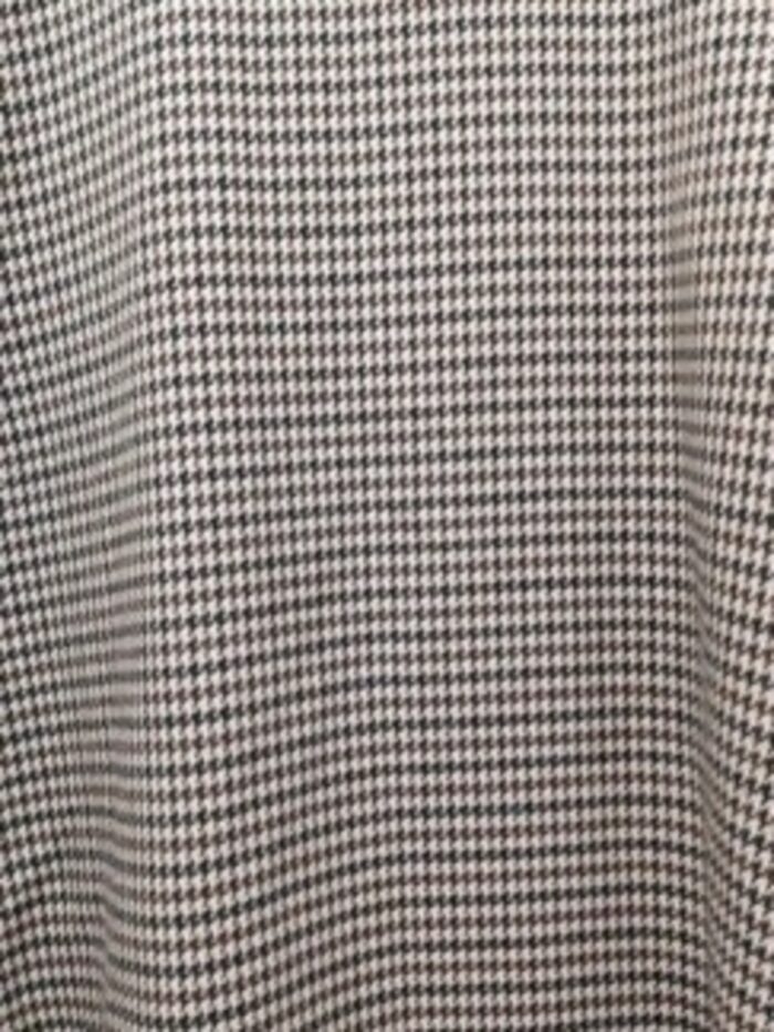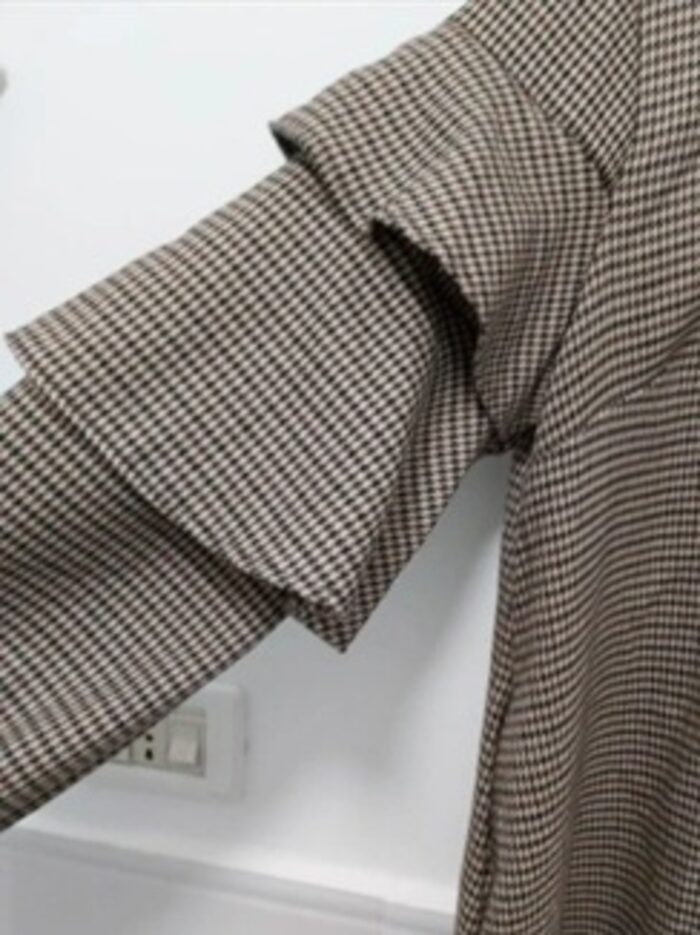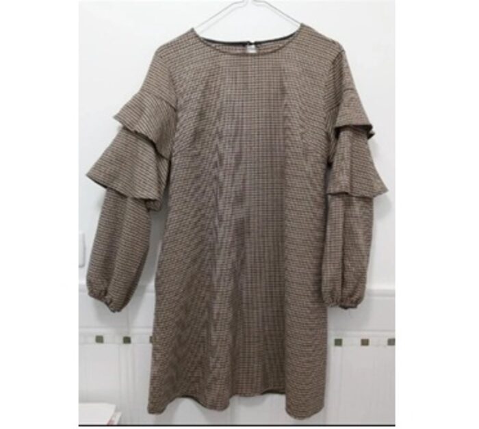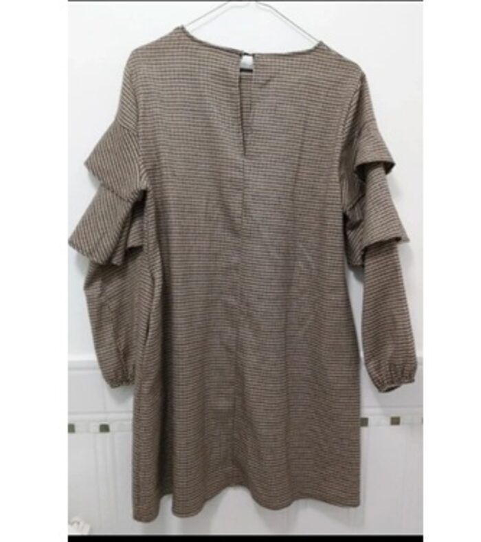Vestito caldo in lana, a quadretti; con balze sulle spalle e elastici sui polsi che danno una vestibilità a sbuffo alle maniche