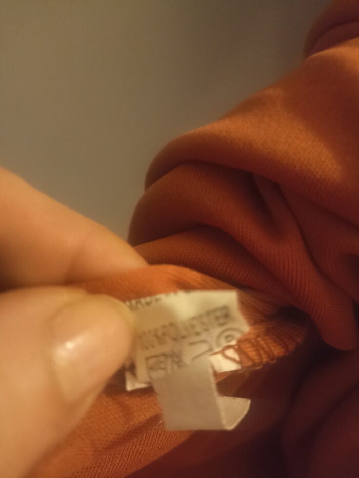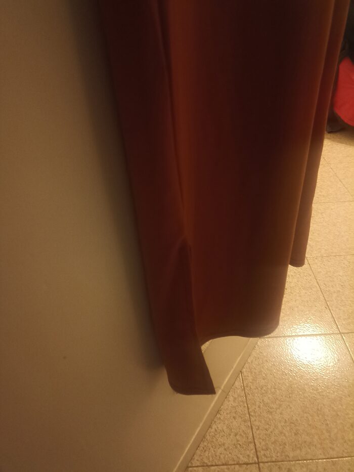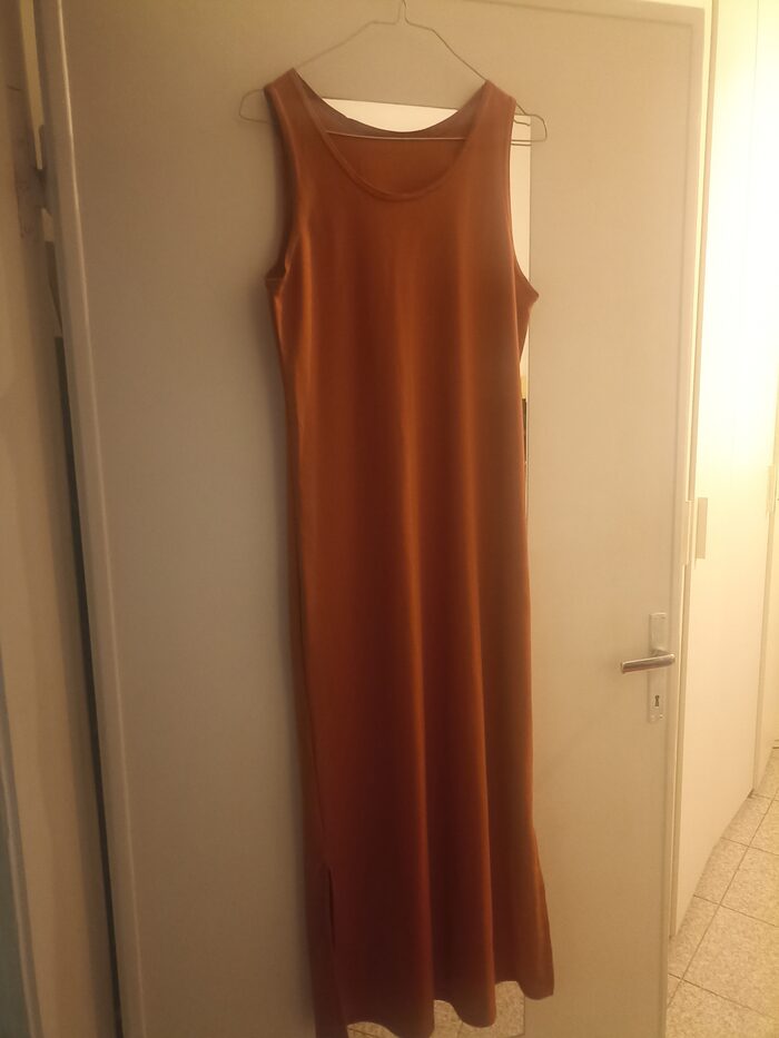 Vestito lungo tipo canotta, arancione, veste M/L, lunghezza 100 con spacchetti simmetrici al fondo di 20 cm, 43cm di ascelle, poliestere .