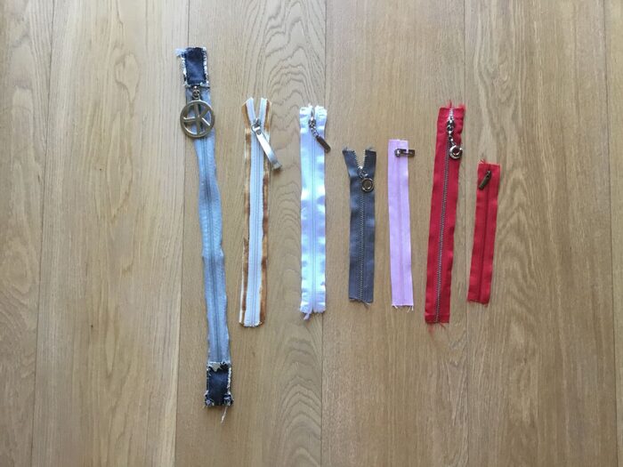 Cerniere / zip recuperate da borse buttate, quindi senza fermo, ma si può ovviare con un paio di punti. Tutte scorrono bene e sono perfettamente funzionanti.Misure in cm (parte utilizzabile): grigia chiara 37, bicolore 28, bianca 25, grigia 18, rosa 20, rossa 26, altra rossa 16.1 credito cadauna, 5 crediti tutte .