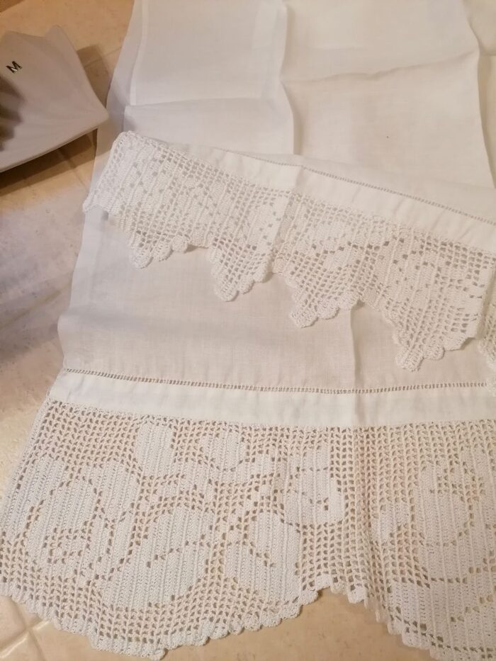 Set Asciugamano + Ospite. Lavorazione Uncinetto. Bordura Asciugamano (misure indicative cm 15) Ospite (misure indicative cm 11). .