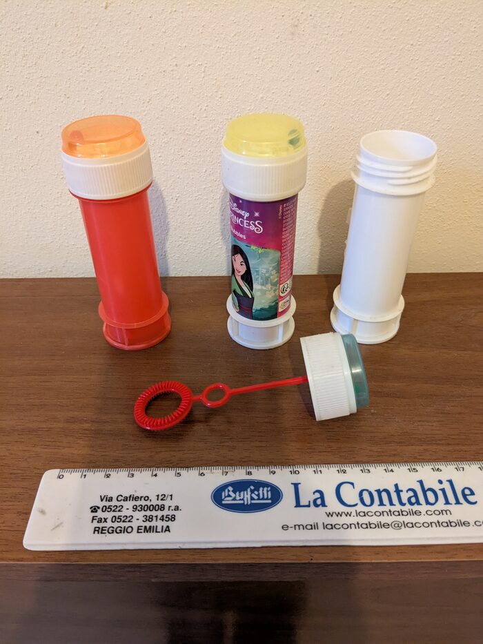 3 flaconcini per bolle di sapone, vuoti. Completi di tutto (anche del classico giochino con la pallina sul tappo). Capienza 60ml .