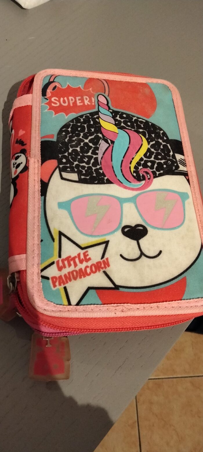 Astuccio rosa per le elementari, in buono stato, a parte due lacci scuciti, come si vede dalla foto. .