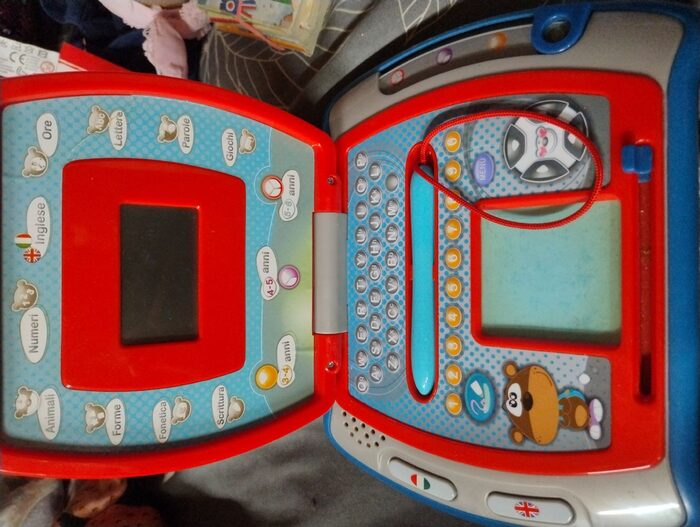 Dai 3 ai 6 anniNon funziona più la parte bassa dove si scrive con la penna per il resto è ok.Funziona con tre pile stilo AA .
