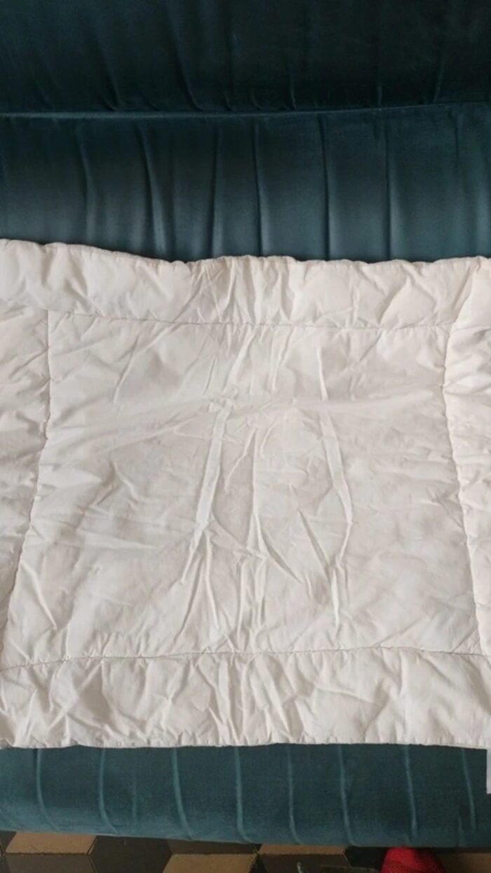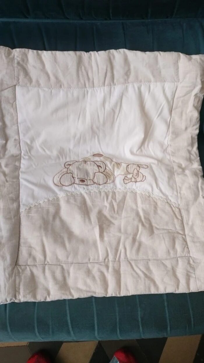 copertina con applicazione, imbottita , misure 60x65 .