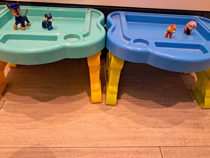 Coppia di piccoli tavolini in plastica per giocare.alti circa 24 cm, larghi 60 e profondi 40 cm .