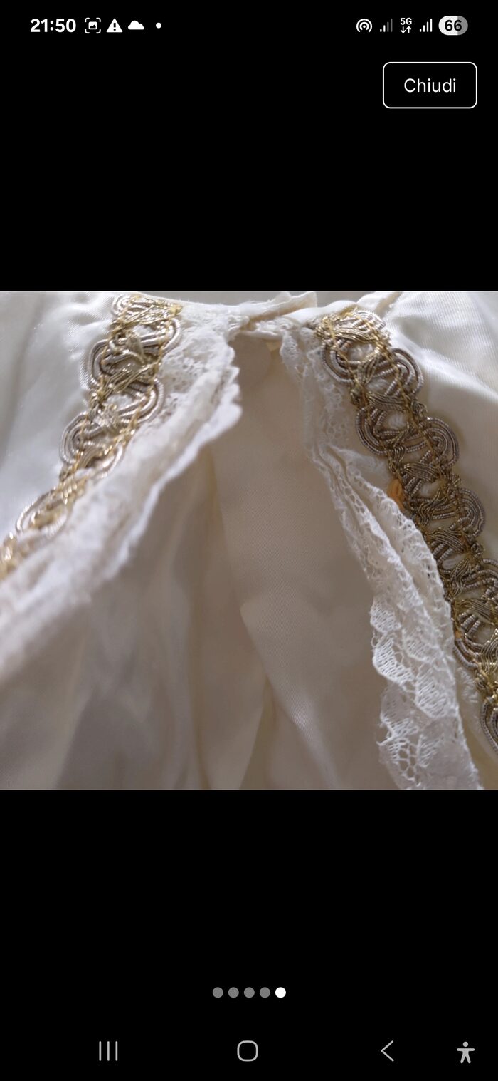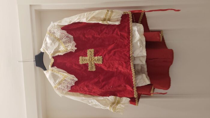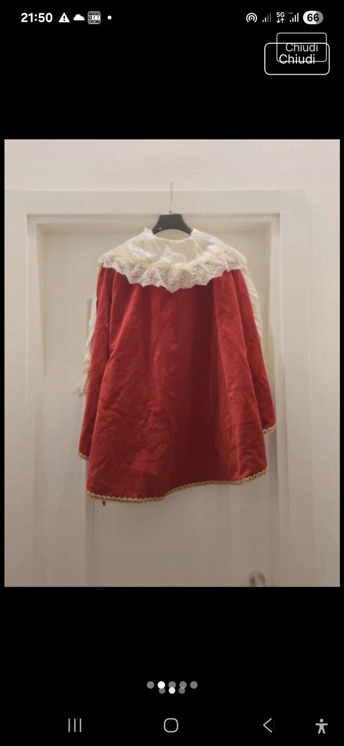Costume da moschettiere o simile, composto da camicia e cappa. Ben rifinito. Per bambini o bambine: a richiesta posso fornire misure precise perché non c''è etichetta.Stessa cosa vale per la composizione: la camicia appare di raso e la cappa di velluto ma non solo la composizione esatta del tessuto.Non stirato ma in perfette condizioni