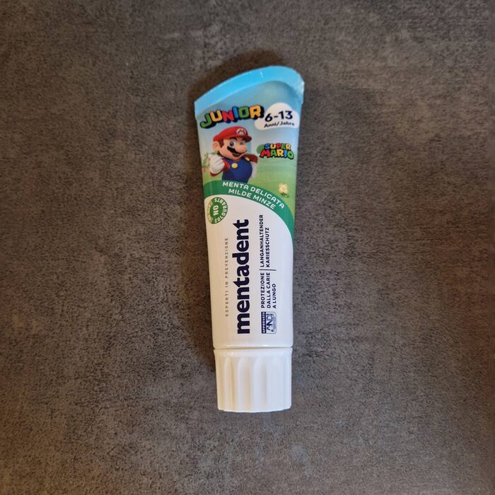 Dentifricio per bambini da 6 anni in su. Solo provato. Aperto il 25.04.26 scadenza 12 mesi. Gusto menta. .