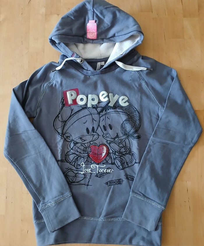 Felpa pari al nuovo, lavata e indossata una sola volta, perché a mia figlia non piaceva. Cotone elasticizzato, cappuccio morbido, taglia 12. Da ascella ad ascella 40 cm, lunghezza presa da dietro 53 cm. .