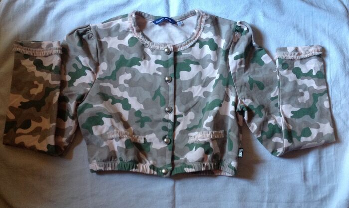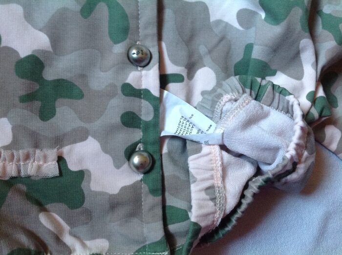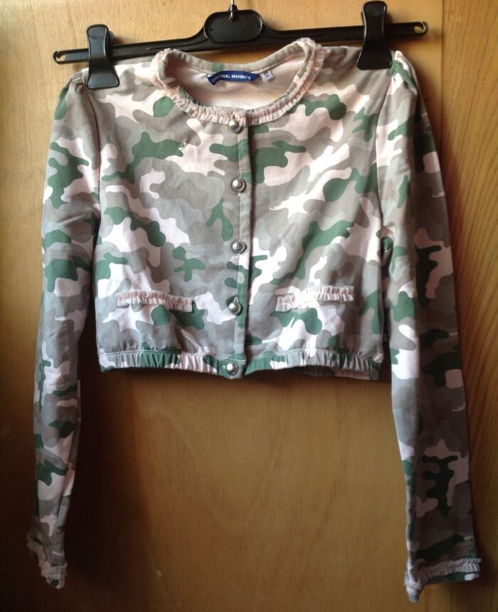 Nuovissima, ma metto usata poco perché ha due bottoni un po' rovinati (foto). Supercarina, camouflage mimetico su rosa cipria, rifiniture di tulle, spalle 34 ascelle 41 lunghezza 35 cm, 95% cotone 5% elastan. Categoria 10-12 o 12-14? .