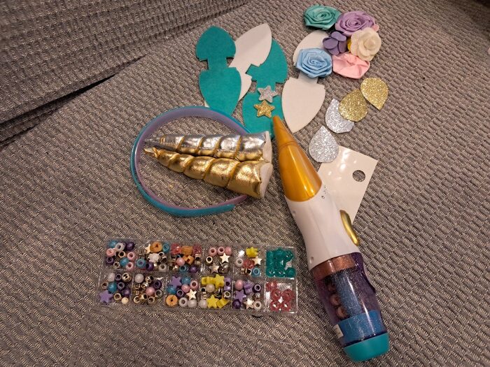 Kit pre creare cerchietti a tema unicorno e per farsi le treccine di perline. Serve del biadesivo per fissare alcuni elementi al cerchietto .