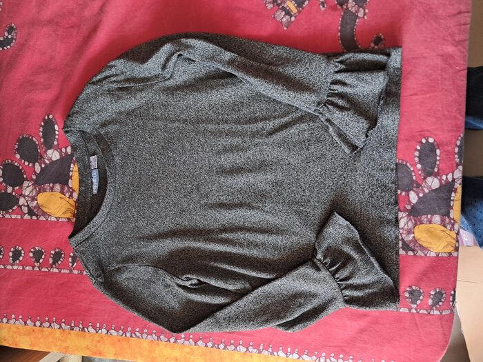 Maglia taglia 8-10 anni con maniche particolari, in poliestere e elastame. In ottimo stato, pesantina .
