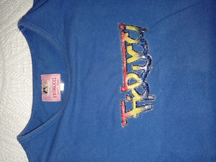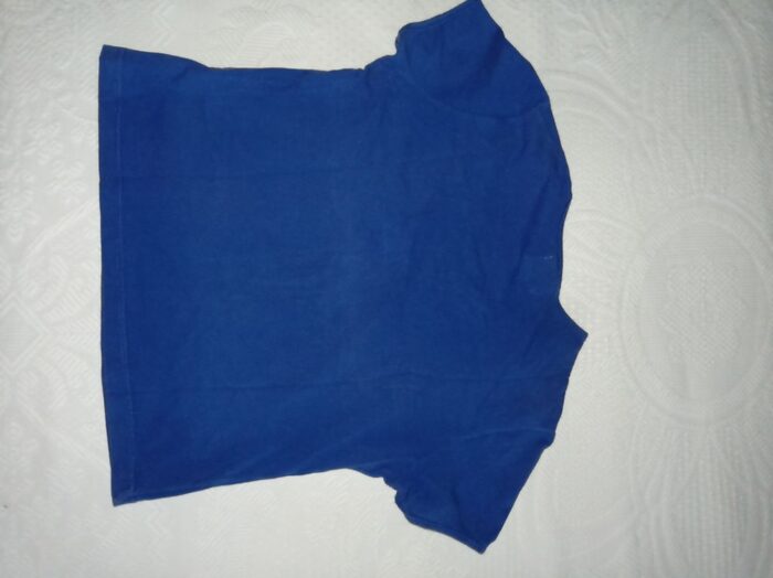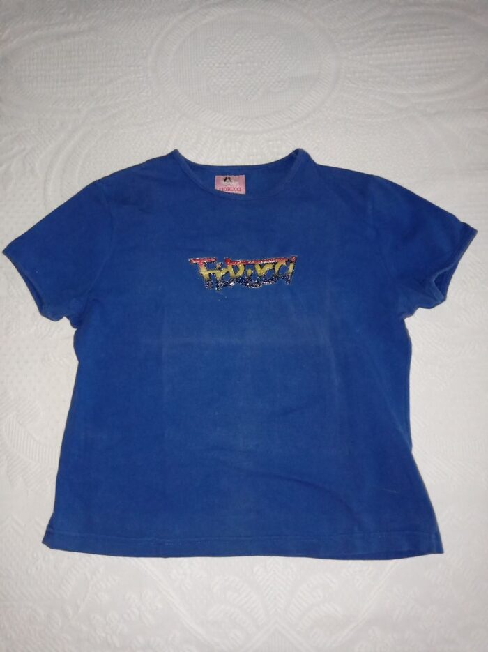 Maglietta bambina, marca Fiorucci, colore blu.Dimensioni 37cm spalle, 13 cm la manica, 46 di vita e 51 lunghezza.Ha diversi anni ma è ancora in buone condizioni, leggermente scolorita causa piega. .