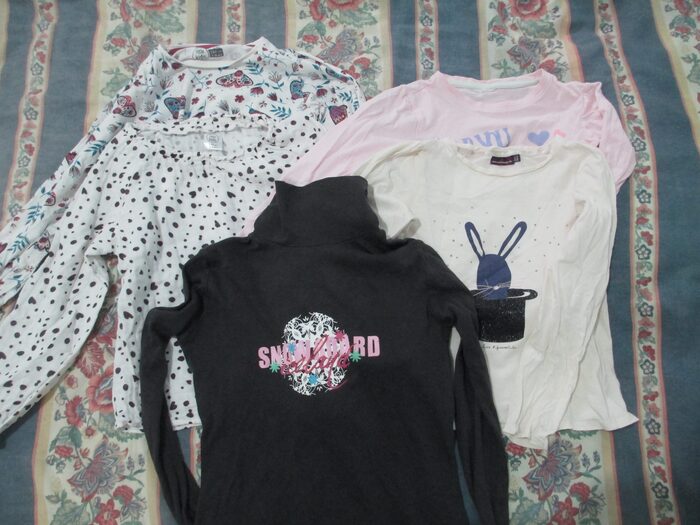 Cinque magliette a maniche lunghe per bimba, taglia 7/8 anni.