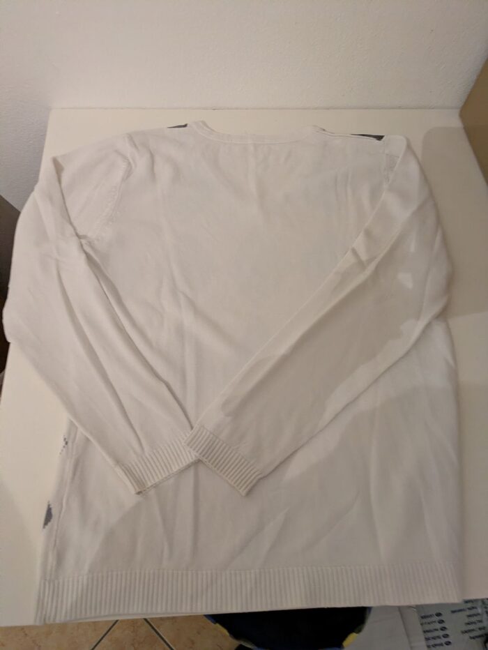 Maglioncino bimba tg 12/13 anni, l etichetta non c''è, ma dovrebbe essere questa la taglia. Viscosa, ed elasticizzato, colore bianco a stampa rombi grigio. .