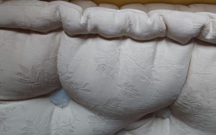 Materasso in pura lana fatto a mano su misure per una culla a dondolo che avevo utilizzato per mio figlio. cucito interamente a mano. Misure 95x40 circa, non è perfettamente rettangolare, l''altro lato corto misura 37 cm. Altezza 10 cm. La parte che usavo come sotto presenta dei piccoli strappi nella fodera, se qualcuno fosse interessato posso dargli due punti. Comunque la stoffa è resistente e in buone condizioni. .