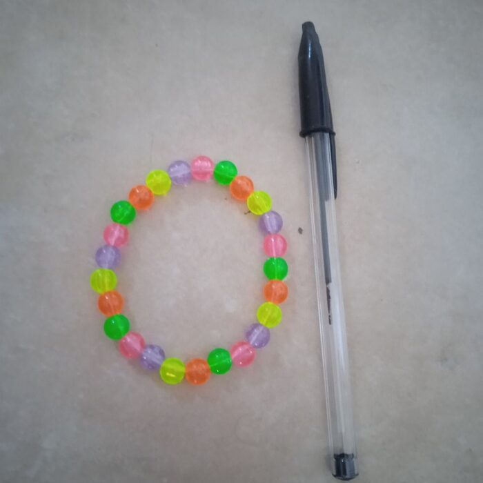 In plastica, con elastico ( dunque adattabile al polso). La penna per le dimensioni. .
