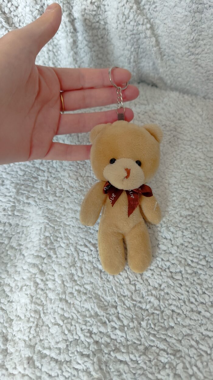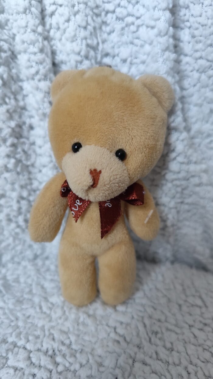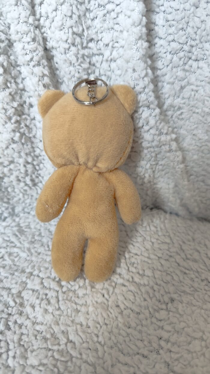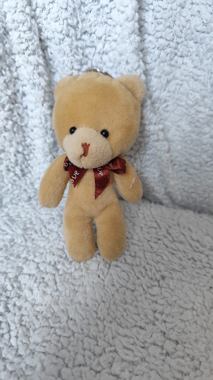 Portachiavi con orsetto in peluche morbido, marrone chiaro con fiocchetto, in perfette condizioni, simpatico e carino.