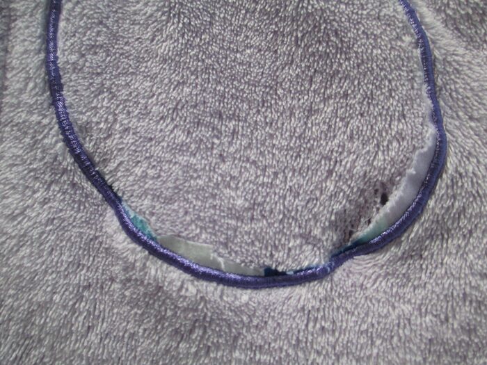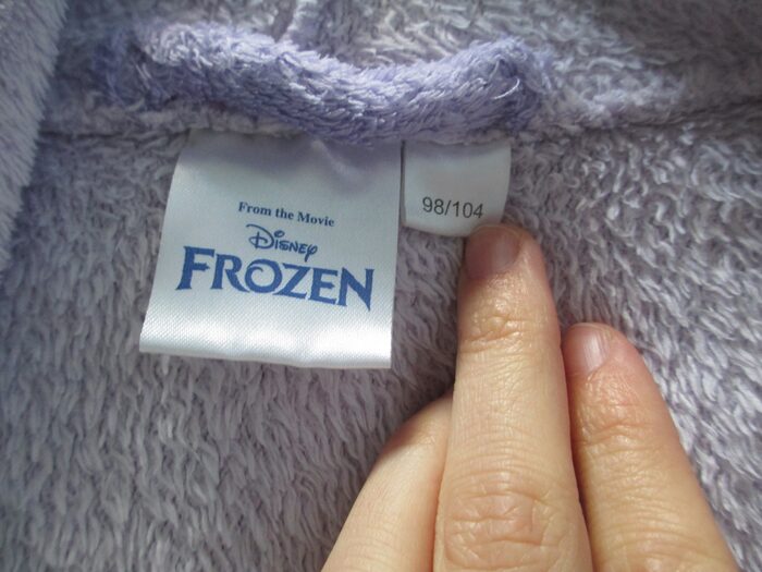 Accappatoio in pile di Frozen taglia 98/104 (3-5 anni circa).Il logo è stato tagliata (vedi foto). .