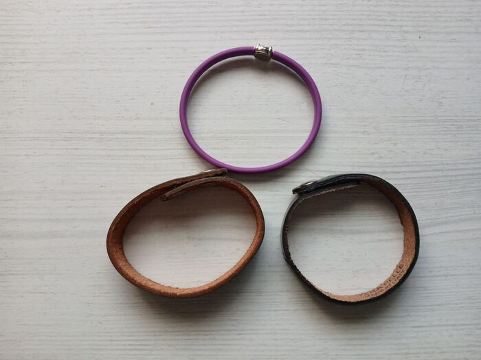 I due braccialetti in pelle sono lunghi entrambi 22 cm, hanno doppio bottone. Quello più chiaro, vedi foto, ha una piccola sbucciatura. Forse è quello che è stato indossato. Gli altri sono nuovi.L''altro color viola è in gomma misura esternamente 21 cm. .