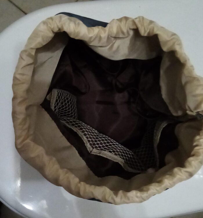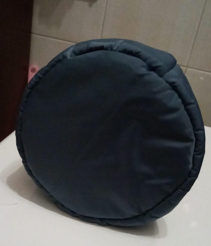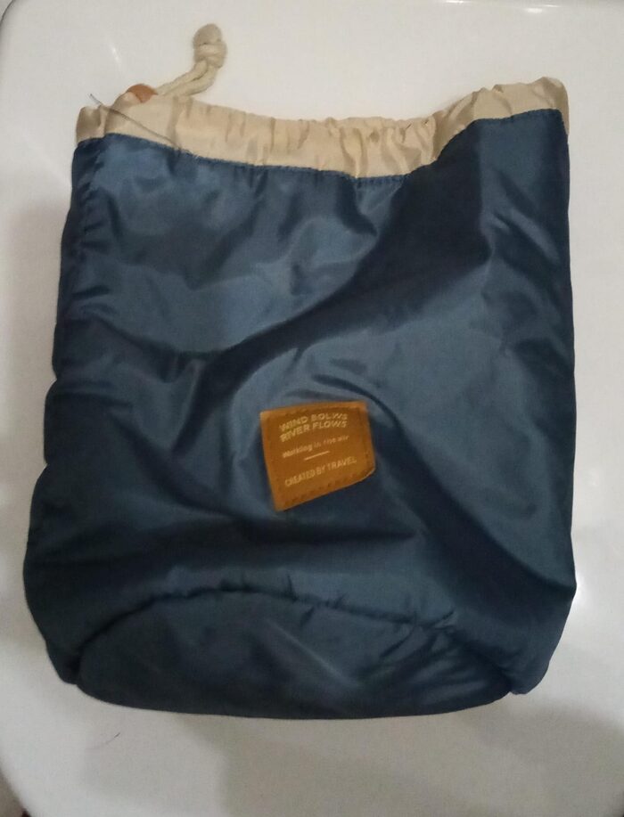 Preso in baratto una vita fa e mai usato da me, è di tessuto sintetico tipo k-way imbottito e chiuso con cordino all'interno ha delle tasche e degli elastici per tenere in piedi i flaconi. Misura circa cm 16 di diametro e cm 23 di altezza .