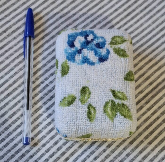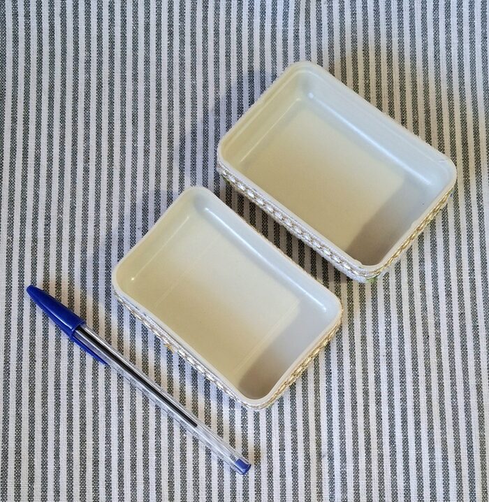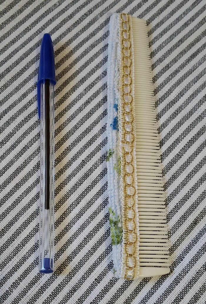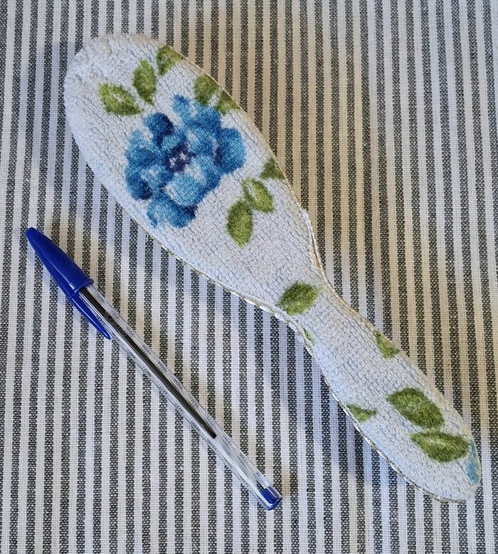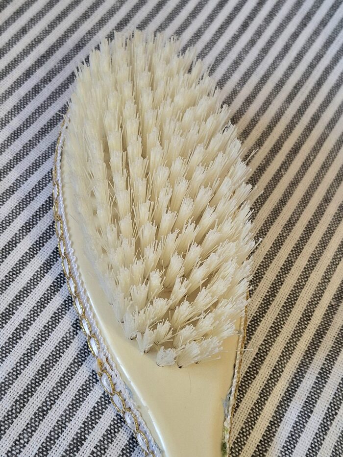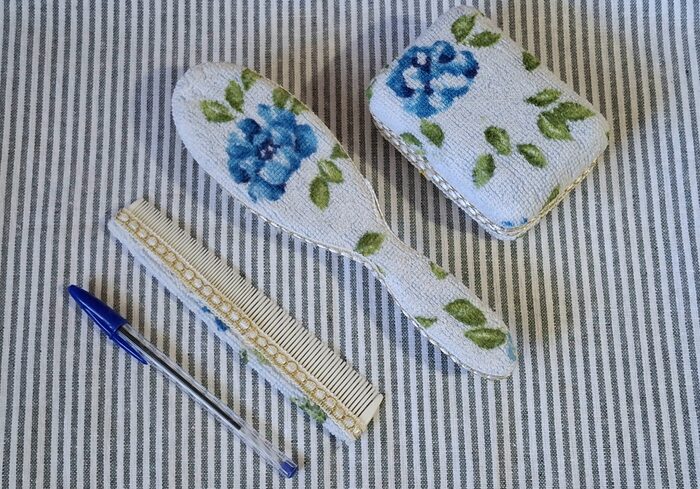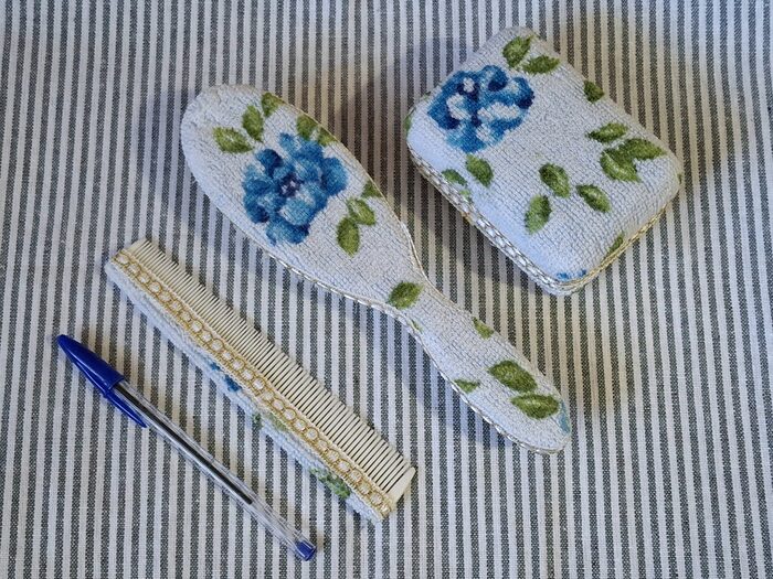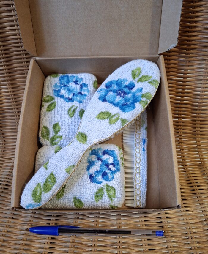 Set composto da spazzola, pettine e porta sapone in plastica rivestita di tessuto.