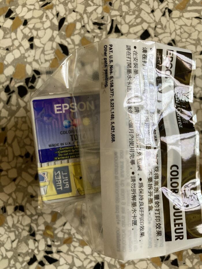 Cartuccia Epson originale sigillata T014. Colori: Ciano, Magenta, Giallo (indicati dai cerchi colorati) Luogo di produzione: Made in U.K. (Fabbricato nel Regno Unito) Contiene glicole dietilenico. .