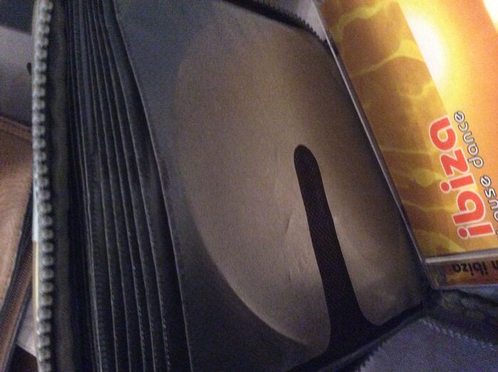 In tessuto gommato, fogli con doppia busta porta cd , qualche macchia da utilizzo , tessuto lavabile .