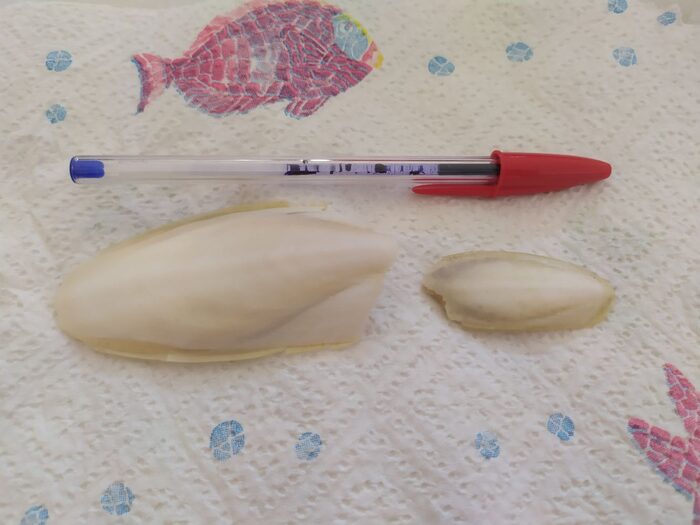 Due ossi di seppia portati dalla mareggiata, lavati in acqua dolce .