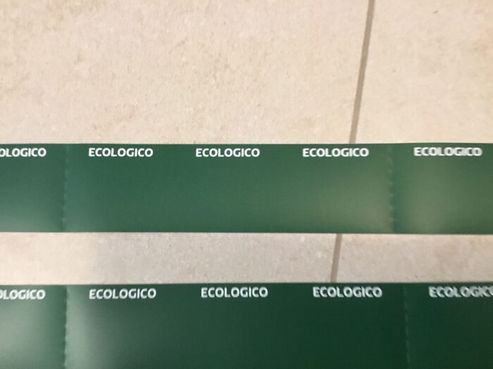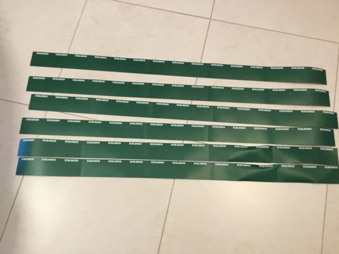 6 strisce verdi lunghe quasi un metro, composte da 5 pezzetti strappabili con scritte in continuo “Ecologico”. Possono servire a qualcuno? Se servono intere le invio arrotolate, altrimenti divido i vari pezzi da poco meno di 20 cm e faccio pacchetto più compatto.Altezza 5,5 cm, materiale plastificato, non adesivo.Annuncio a tempo. .