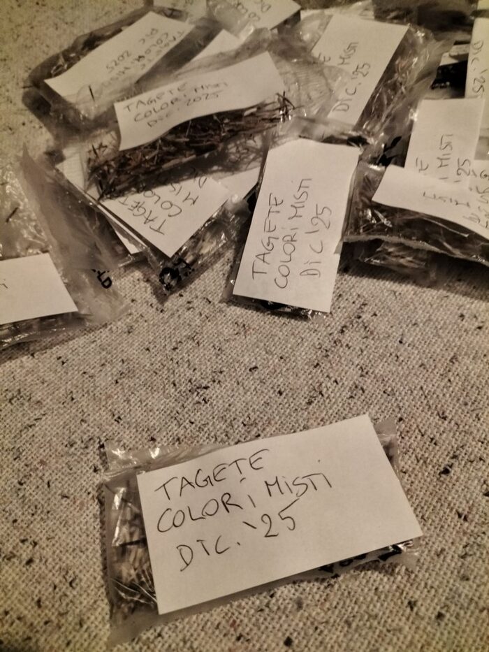 Una bustina di semi di tagete autoprodotti Colori misti: rosso, arancio, screziati, gialli .