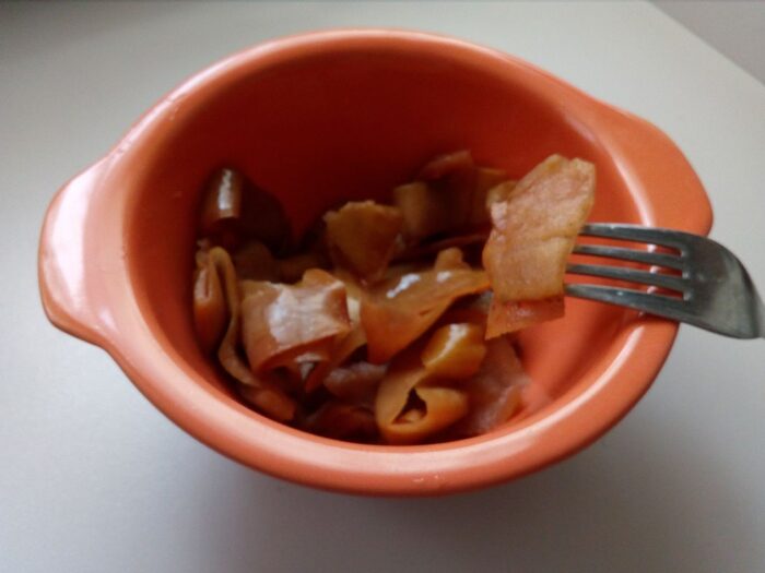 inizio col dire che non mi piacciono le mele crude, quindi per mangiarle le cuocio (una vera libidine per me sono le mele a pezzi con cannella di gabrilla).spesso e volentieri finiscono nella torta di mele e siccome non si butta via niente... cuocio anche le bucce!in una casseruola bassa e larga metto le mie bucce, copro con acqua e aggiungo zucchero di canna e cannella a piacere.metto a bollire per un pò mentre le smuovo, poi lascio sobbollire finchè non si asciuga tutta l''acqua e le bucce quasi si caramellano.buone tiepide ma (per il mio gusto) buonissime fredde come gratificazione dolce senza troppi sensi di colpa eheheheh ^_^ .