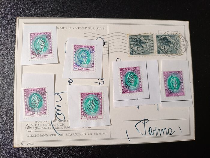 Una cartolina con relativi francobolli e 6 marche da bollo. Regalo a chi li vuole .