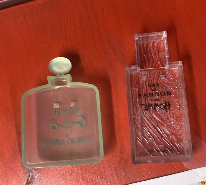 Due plastiche a forma di profumo. Condizioni come da foto, altezza 6 cm circa. Per riutilizzo creativo. .
