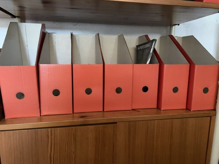 5 portariviste o fumetti o documenti pieghevoli colore rosso in cartone dimensioni 30x25x10 dell’’Ikea .