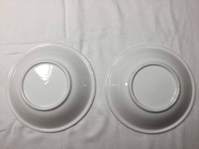 2 piatti fondi bianco panna con riga rossa, Ceramica Dalia Castelforte, Made in Italy.Non perfetti, qualche lieve sbeccatura, mentre le screpolature sotto l’invetriatura non so se erano una caratteristica già all’origine oppure venute dopo. Ancora sfruttabili senza pretese oppure per qualche riciclo creativo. Diametro 22, altezza 4,7. .