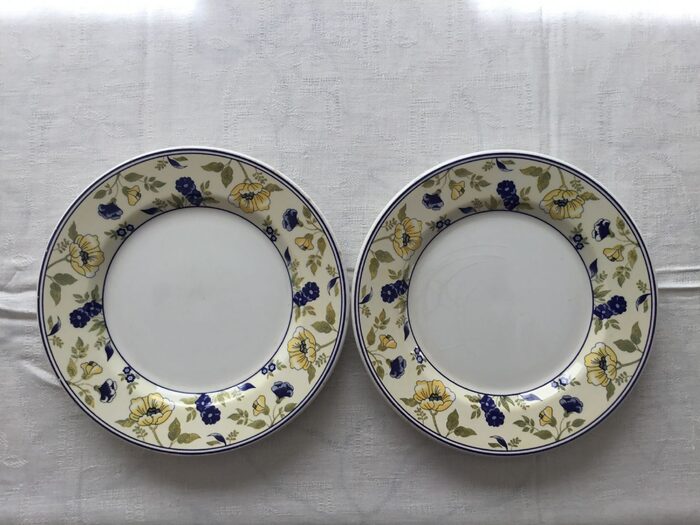 2 piatti frutta con decoro sul giallo e blu, diametro cm 19,5. Ceramica Quadrifoglio.Quello a ds in condizioni peggiori dell’altro. Diciamo che i 2 crediti sono per quello sano e l’altro lo regalo assieme. .