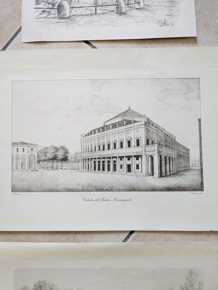 2) misure cm 38x28,5 - edita da Il Resto del Carlino in collaborazione con la (allora) Cassa di Risparmio di Reggio Emilia, raffigura una veduta del teatro municipale Valli a epoca precedente al 1857
