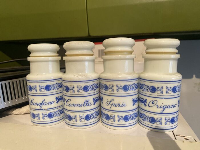 Vasetti porta spezie, mai usati ma sulla foto molto impolverati. Ovviamente pulisco prima di consegnare. 12 × 5 cm circa. .