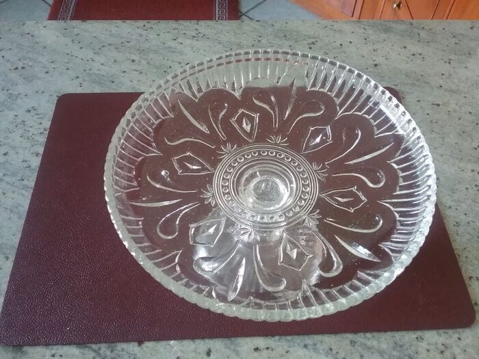 Alzatina in vetro, misure 24,5 diametro piatto x 16 cm di altezza. Nessuna sbeccature, qualche imperfezione nel vetro del piatto, al tatto non è perfettamente liscio. Vedi ultima foto. .