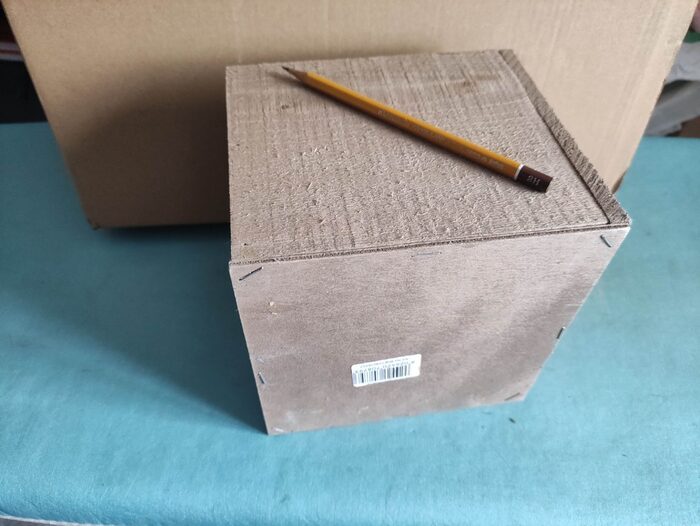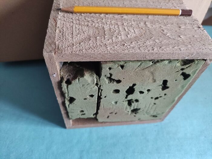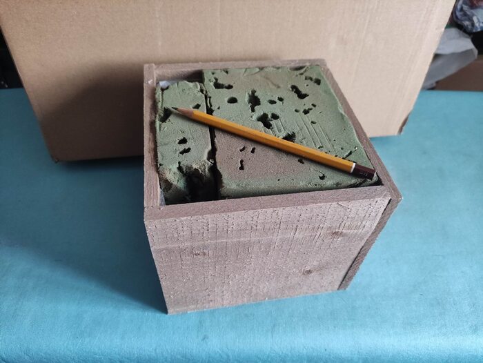 È una cassettina cubica in legno, in cui si mettono fiori freschi o secchi per fare delle composizioni. Dentro lascio la spugna che avevo usato io: si può tranquillamente girare e riutilizzare. Io l'avevo ricoperta con tessuto fantasia, ma si può anche verniciare. .