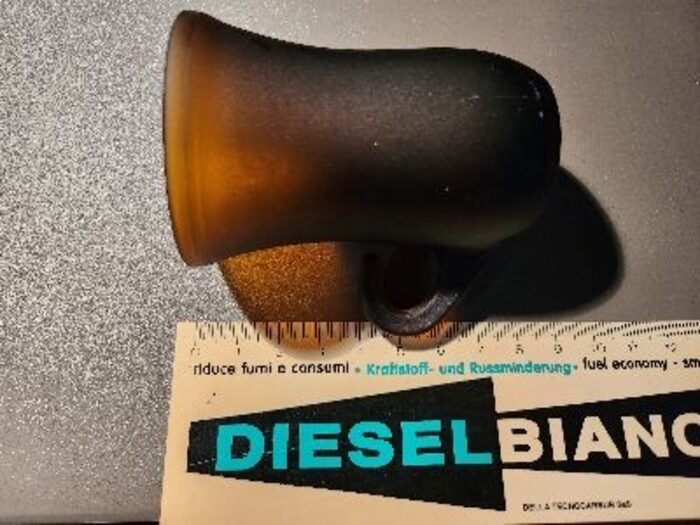 7 Bicchierini in vetro pesante satinato, con manico, non so per quale bevanda ma penso reggano bene caldo e freddo. Solo esposti da molto tempo in vetrina, sono integri ma con alcuni segni dell''età. .