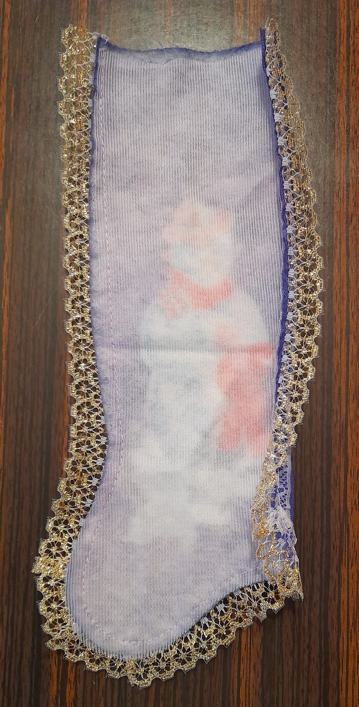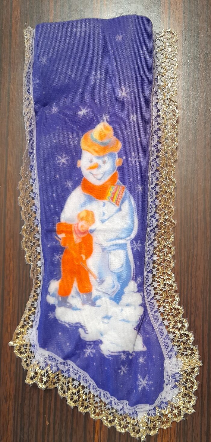 Piccola (29cm) calza della Befana in tessuto sintetico e pizzo, con immagine di pupazzo di neve. .