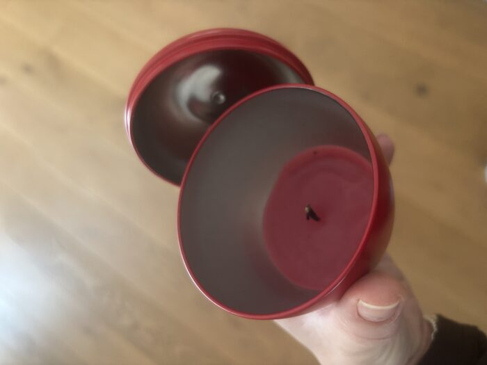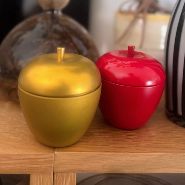 Regalo candela a forma di mela (quella rossa) finita ma riutilizzabile per fare altra candela o come porta oggetti se si toglie la cera rimasta. Bellissima come decorazione.