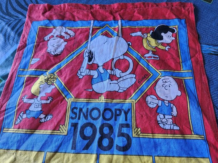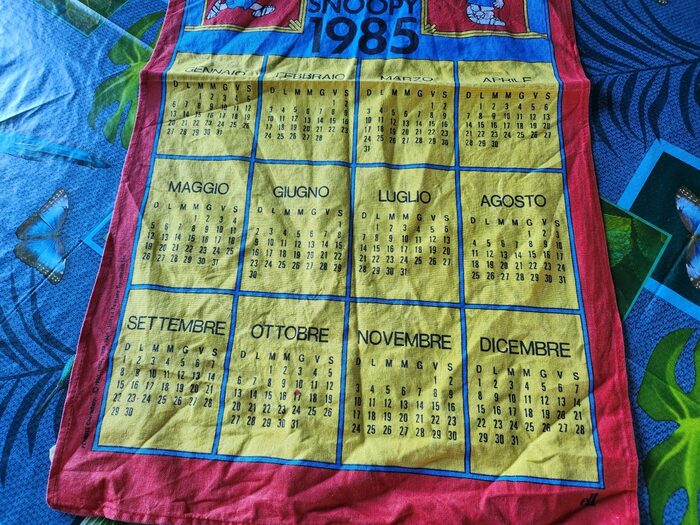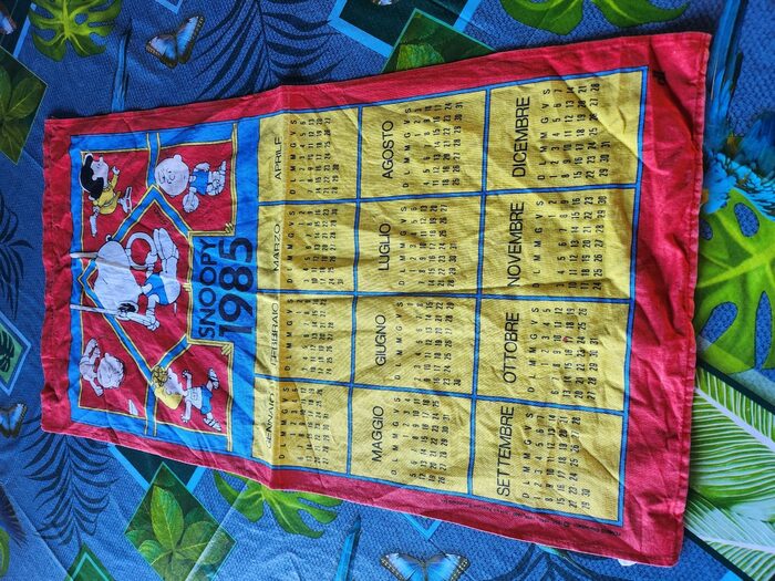 Calendario Snoopy vintage, in tessuto di cotone cm 75 x 40, si può usare anche come canovaccio. Lavato ma non stirato. .
