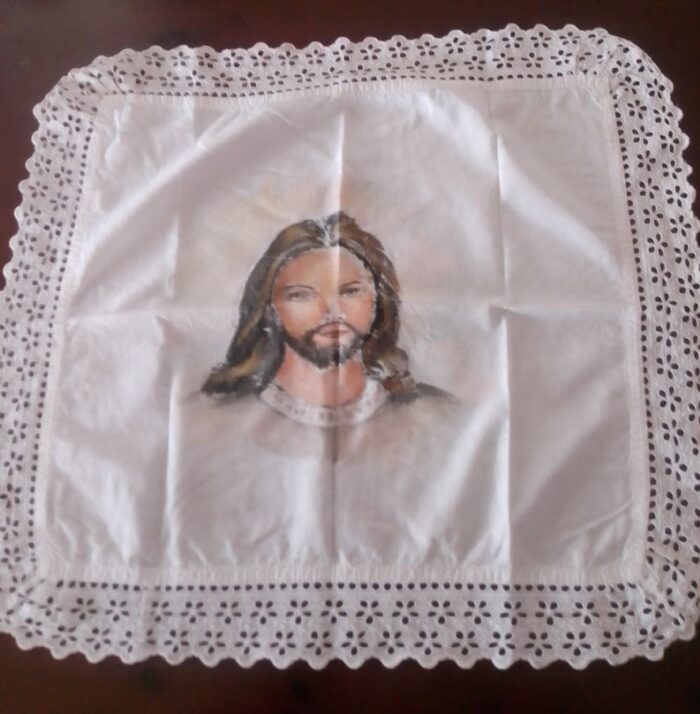 Centrino cotone dipinto a mano leggermente sbiadito dai lavaggi bellissimo ma non ho più dove metterlo cm 55x5 .