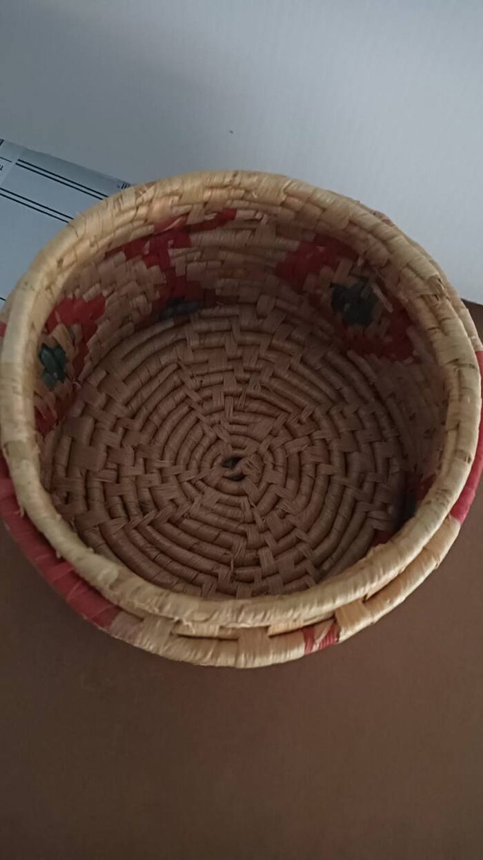 cestino sardo in paglia intreciata misure altezza 10*12 di diametro ,non ci sono sfilacciature ma il sopra del coperchio è vissuto andrebbe messo in acqua e ravvivato .