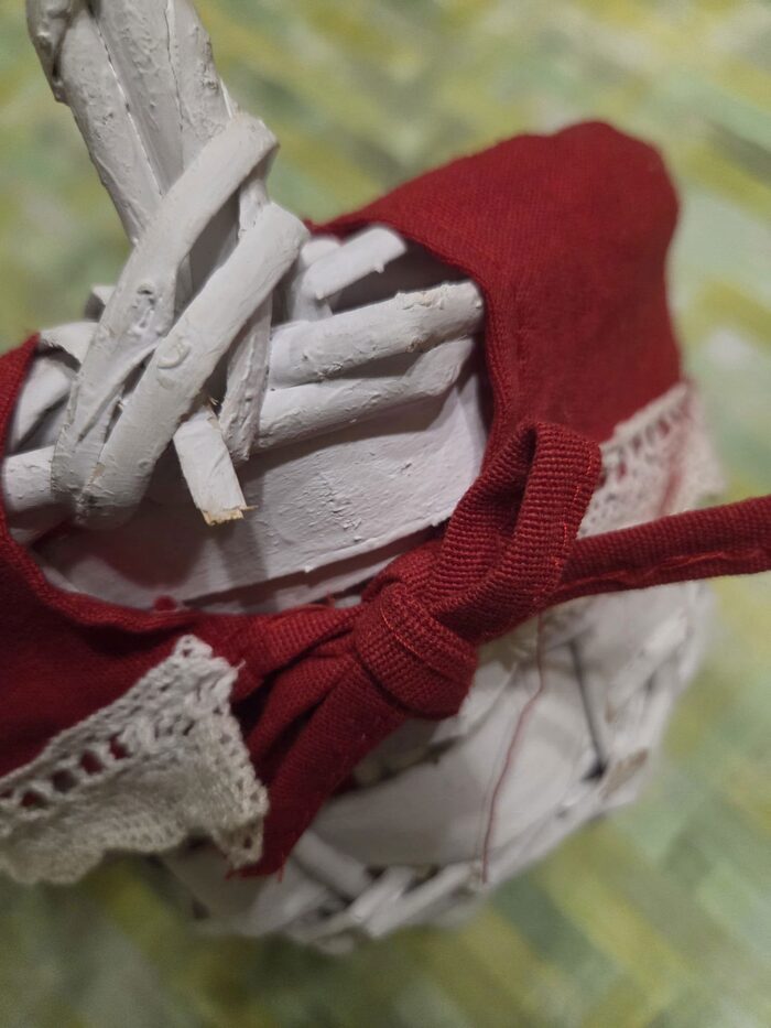 Cestino bianco tipo vimini con interno rosso, tenuto solo esposto .