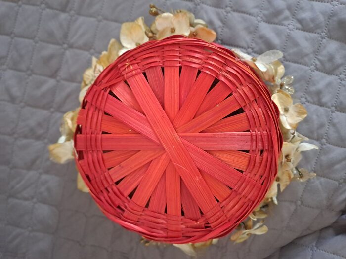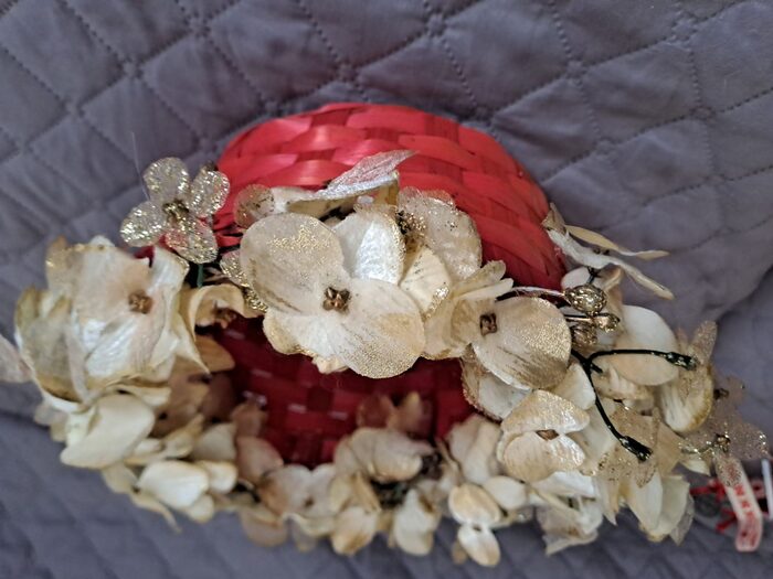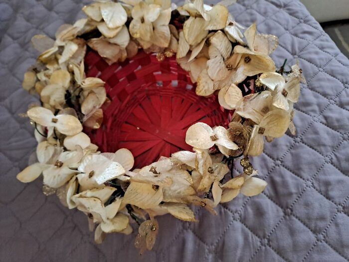 Cesto in legno con fiori finti dorati beige , qualche fiore un pò rovinato ma assolutamente utilizzabile, diametro 20 .